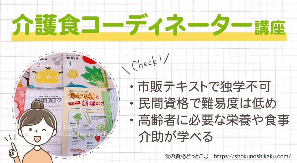 - 介護食コーディネーター資格は市販テキストで独学できない。ユーキャンの講座受講が条件
