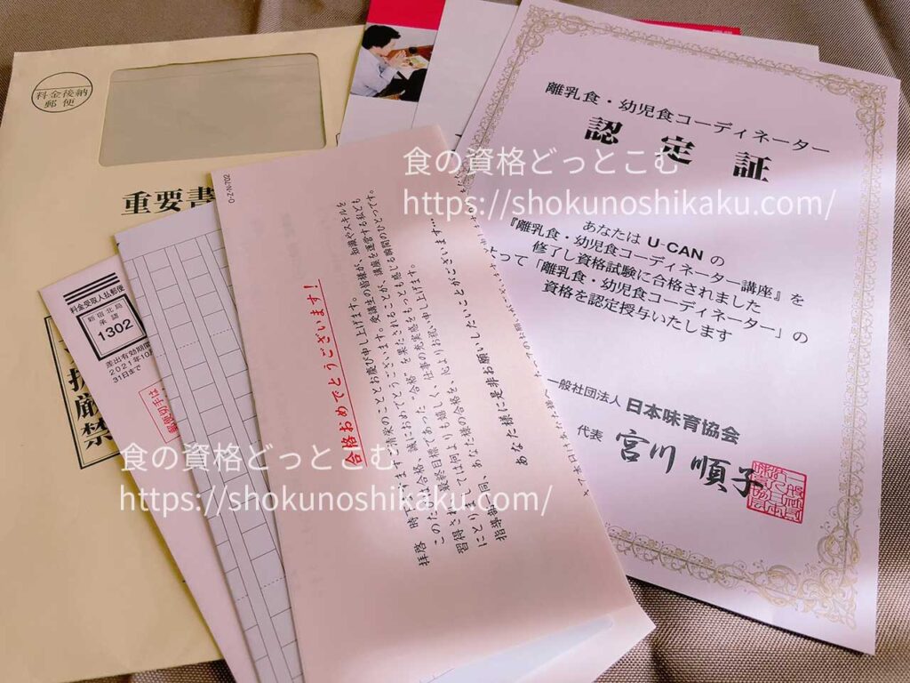 離乳食・幼児食コーディネーター資格の合否通知が届きます。不合格の場合は、受講期間の12ヶ月以内に残り2回まで再受験ができます。